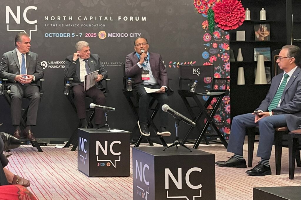 Durante el panel “El futuro empieza ahora: Reubicación y Crecimiento Regional”, realizado en la Ciudad de México, el alcalde de Escobedo, Andrés Mijes, compartió espacio con Francisco Cervantes, presidente del Consejo Coordinador Empresarial (CCE); Max El-Mann Arazi, presidente del Comité Especial de Inversión y Reubicación Empresarial del CCE; y María de Haas, directora general de Asuntos Internacionales de la Secretaría de Economía.